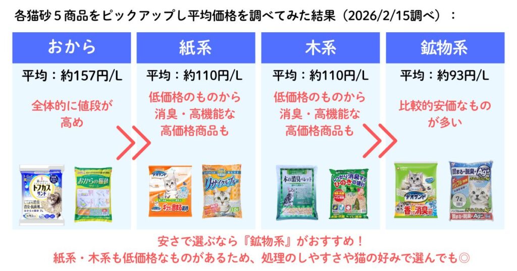 節約ポイント: まとめ買いやAmazonの定期便を使うと、1袋あたり100〜200円安くなります。最初は「どの砂を猫が気に入るか」試す必要があるので、慣れてからまとめ買いがおすすめ。